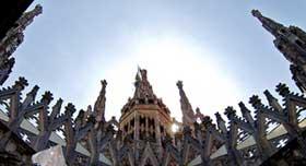 Terrazas de la Catedral Las Terrazas en el techo de la Catedral en Milán representan una novedad única por lo que concerne la construcción del techo de las catedrales. Se extienden sobre un área de 8.000 m, cubierta de mármol de Condoglia (una cava especiál que se encuentra en el Lago Mayor) continuamente mantenido. Hay que subir 201 pasos para llegar a la cima y una vaz allí, tendrás una vista impresionante sobre toda la ciudad. Sobre la terraza los visitantes podrán admirar magníficos arcos, los 135 pináculos de la catedral, las numerosas estatuas (180) y respirar un ambiente tranquilo en esta ciudad constantemente activa, con buen tiempo puede ver incluso las Alpes italianas y suizas. Desde las terrazas verá la famosa "La Madonnina", la estatua de cobre dorado de Giuseppe Perego, símbolo de la ciudad y situada sobre la aguja principal de la catedral.